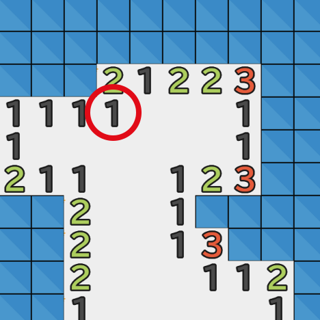 上図の数字は、そのマス目の周囲8マスのうち、何個爆弾が存在するかを表しています。例えば、丸で囲んだ部分に注目してください。 1と数字が書いていますが、縦横斜めに隣接している「青い」マス目のうち一つだけ爆弾が存在する事を示しています。